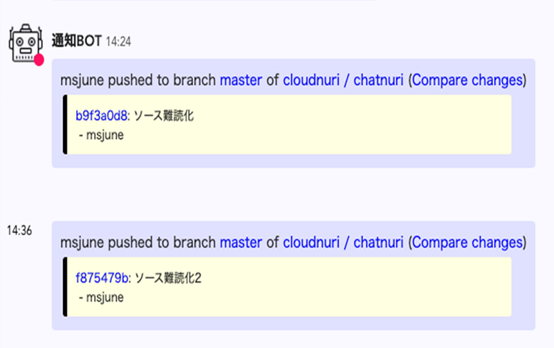 「スケジュール変動時の通知」共有されている誰かのスケジュールに変動があったら、Botの方からその内容を通知します。