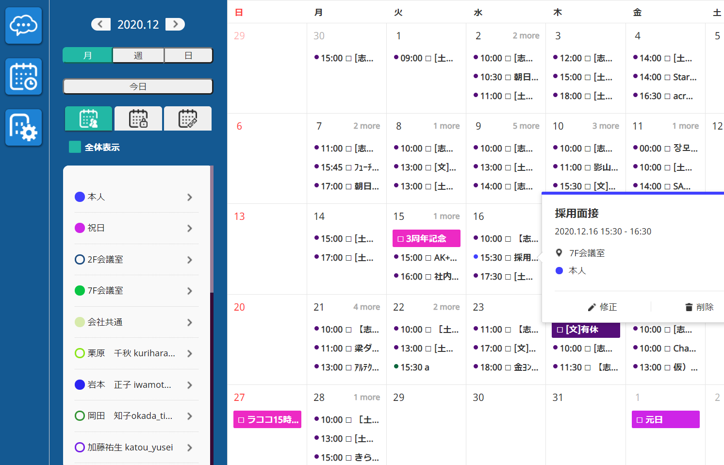 「社員のスケジュール追加と確認」選択した複数の社員のスケジュールを追加すれば、一つのカレンダーで一緒に確認することができます。