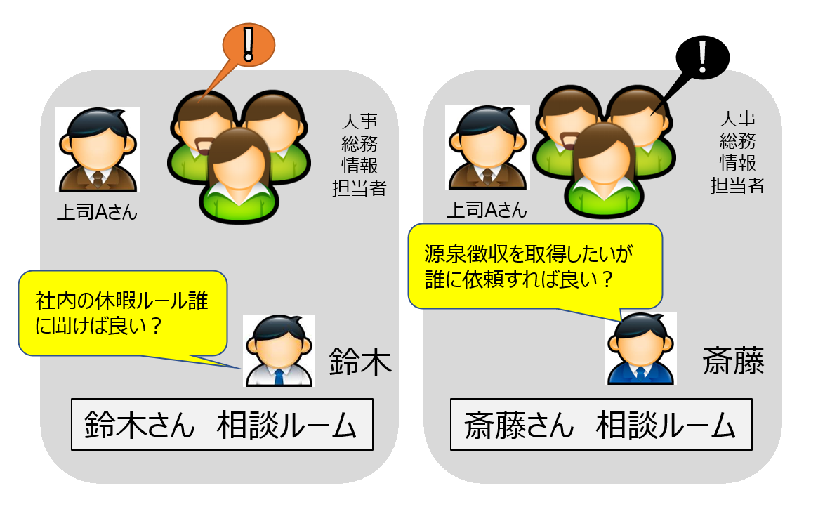 例えば、Aさんの「相談ルーム」にはAさんをサポートする管理部担当者・部署リーダーとAさんのみ入っているので他のメンバーに言えずに相談できます。