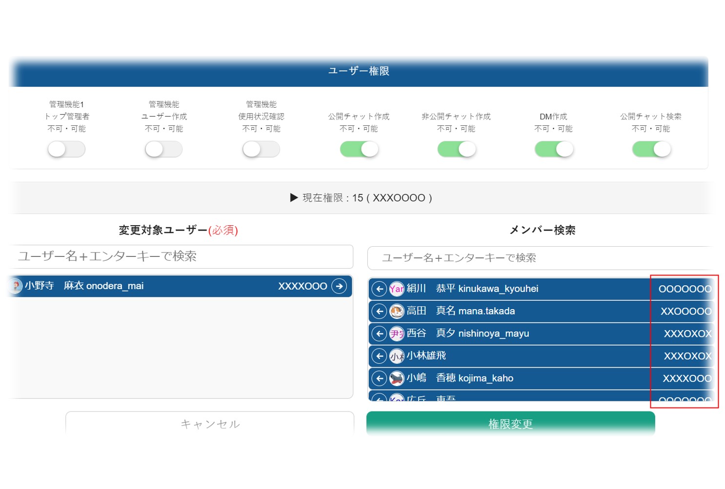 ユーザごとに『ユーザ作成』、『ログ確認』、『公開チャット作成』、『非公開チャット作成』、『ダイレクトチャット』、『公開チャット検索』